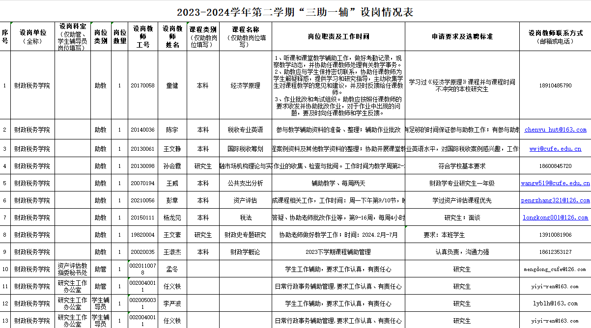 下表是必一运动2023-2024学年第二学期“三助一辅”设岗情况,请有意向申报的研究生根据公布的联系方式自行联系设岗教师,设岗老师在3月12日前完成选聘工作。