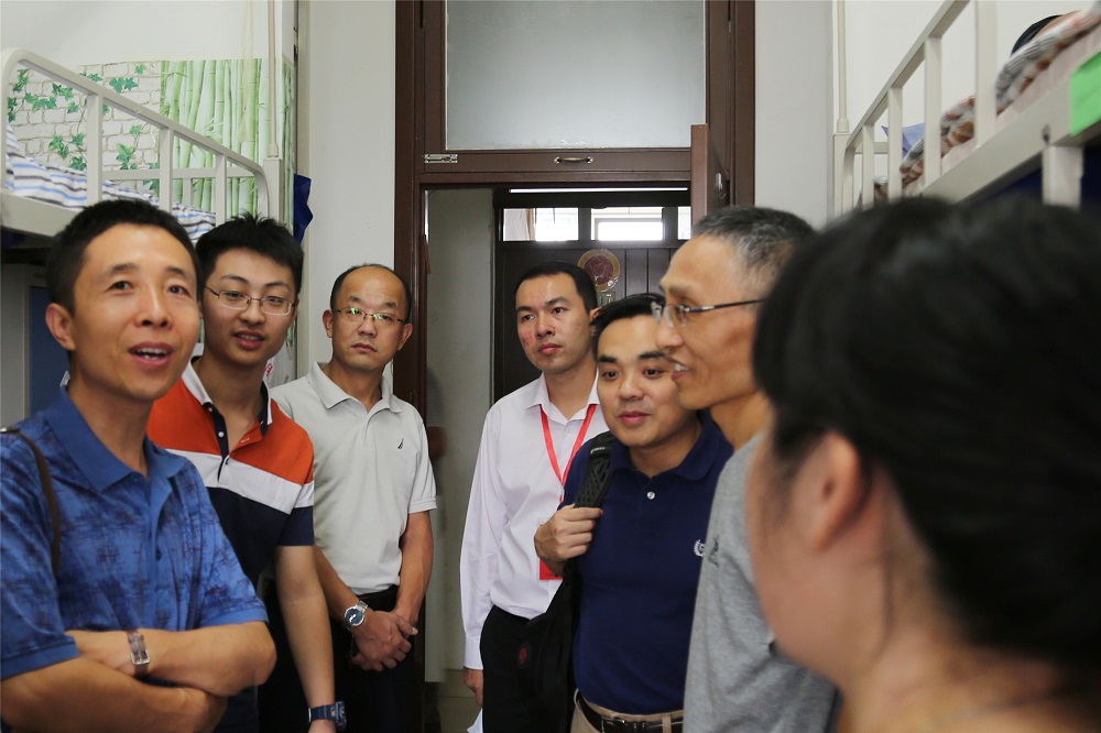 下午2点,必一运动经理白彦锋老师,党委书记樊勇老师,党委副书记宋立岩老师和员工处办公室主任兼2016级新生辅导员于来老师走访了2号员工宿舍楼,看望正式成为中财学子的新生。看到领导老师们的到来,新生和家长们立即停下手头的工作,与老师们积极交流。领导老师亲切地询问同学们的住宿情况,并耐心解答家长们的问题和疑虑。临走时还不忘提醒员工们北京秋季干燥,希望同学们尽快适应生活环境。