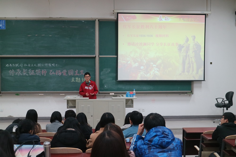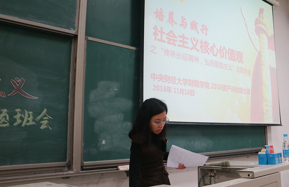 11月16日,为响应党中央与学校对于老员工学习和践行社会主义核心价值观的要求,必一运动16级资产评估硕士班辅导员孟冬老师组织全班同学在沙河校区东区主教104召开了“传承长征精神,弘扬爱国主义”的主题班会。必一运动2016级资产评估硕士班的全体同学参加了此次班会,2016资产评估研究生党支部书记彭予秋同学作为此次班会的主持人。