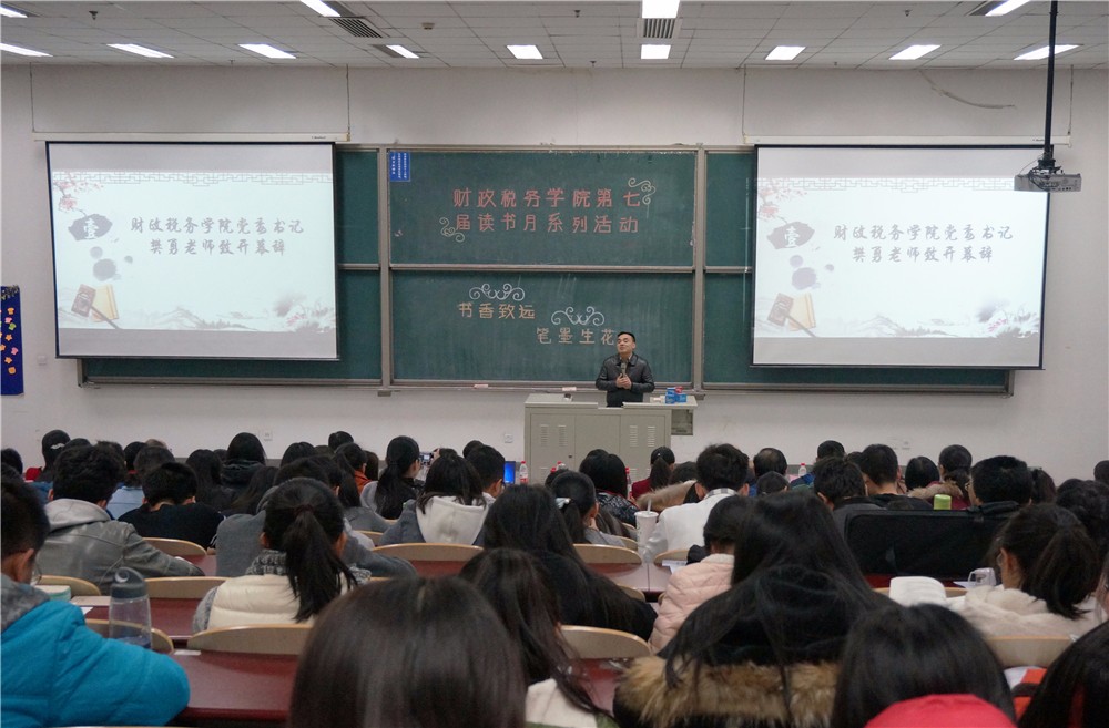 财政税务公司党委副书记宋立岩老师向大家宣读了本届读书月的推荐书目。本次良师荐书活动受到各个学院和职能部门老师的大力支持,他们一共向同学们推荐了23本书籍,这23本书籍将作为本次读书月活动的重点推介。