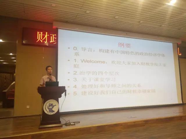 接下来致辞的是财政税务公司党委书记樊勇教授。樊书记首先对2017级新生致以热烈的祝贺,在简单介绍学院当前的规模结构、学科设置、教学资源之后,又诚挚地表达了对各位新生选择中财、信任中财的感谢。樊书记就研究生阶段发挥学习主动性角度提出了四点建议:一是要多读书。“书到用时方恨少”,丰富的积累会积淀成研究素材,在有时间有能力多读书的时候就要为自己的精神楼阁添砖加瓦。二是要勤思考。研究生阶段的学习是一个独立思考独立学术的过程,是一个试图以探索的姿态不断打磨自己能力的过程。而这种勤思考的能力不仅反映在学习中,也同样反映在未来的职场,这是未来不被淘汰的资本。三是要高定位。争取打破“小会计”与“大会计”的界限,不过分朴实,要以社会主义建设引领者的姿态要求自己,以经邦济世为目标鞭策自己,心多大才能走多快。四是要有担当。在我们即将真正迈入社会的过渡期,我们要培养自己的责任感,担当起对集体、对家庭、对工作甚至对国家社会共同事业的使命,在这种伟大的使命感中赢得尊重和成功。