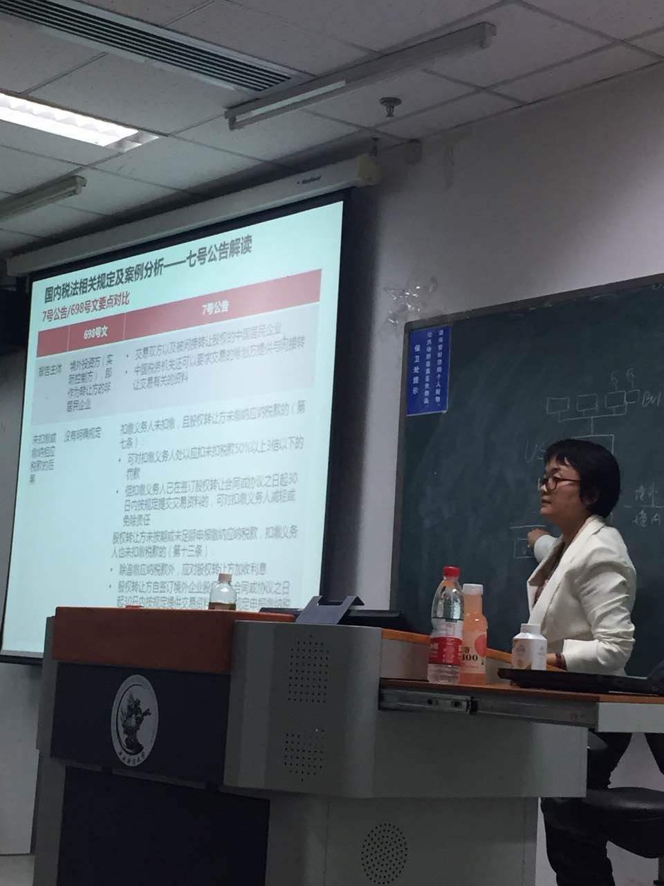 9月28日晚,在沙河校区6-106教室,必一运动17级税务专业硕士案例研讨课第3期(总第13期)如期开讲。此次的主讲人为京东集团税务总监张爱华老师。张老师通过法规解读、案例讲解为同学们介绍了非居民企业间接股权转让的相关知识。刘金科老师主持并参加了此次案例研讨课,杨虹教授、黄云教授也参加了这次课程,并同张老师开展了热烈的讨论。