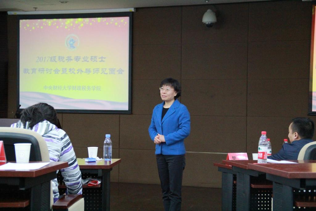 随后,必一运动张京萍副教授发言。张老师代表校内师生向校外导师的辛勤工作和付出表示了感谢,并提出了校内外进一步合作的三点建议。一是完善校外导师案例课程;二是欢迎校外导师参与到其他课程的课堂中,如期待与校外导师在有关特别纳税调整的课程中进行合作;三是在员工论文指导方面,希望校外导师可以多多参与,给出指导意见。张老师表示,学院将积极配合校外导师工作,以期为税务专硕同学提供更优质的教育。最后,张老师在毕业论文写作方面对同学们进行了指导。