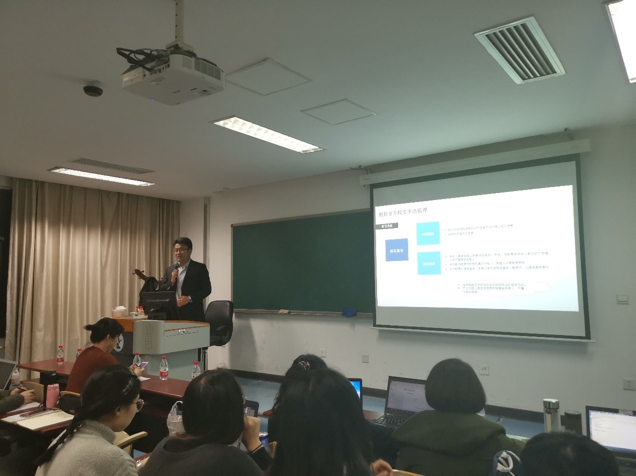本次案例研讨课的主题为“从几个实务问题谈税务法规的演进与辨析”,包括“境内税务例析”和“跨境税务例析”两个部分。首先,宫滨老师向同学们详细介绍了境内租赁业务的相关税务政策与实务税务处理,包括经营租赁业务和融资租赁业务之间的联系和区别, “营改增”改革后融资租赁相关税收政策的变化,租赁业务涉及的企业所得税、印花税、房产税等税收实务问题;接下来,宫老师重点分析了保理业务相关的增值税实务问题。在租赁税务问题上,宫老师还向同学们重点解析了2019年新租赁准则以及产生的税会差异。最后,宫老师就支付跨境租赁服务费的相关税务问题进行了系统讲解。