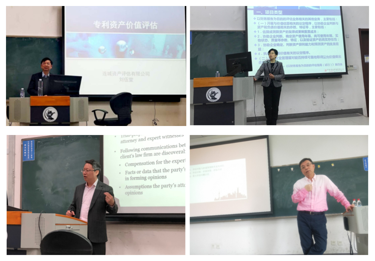 连城资产评估有限公司总经理刘伍堂先生,主要围绕专利资产价值评估和商标著作权资产价值评估展开,结合两个具体案例重点介绍了专利和商标著作权等无形资产价值评估的评估方法;中和资产评估有限公司副董事长王青华女士介绍了以财务报告为目的的资产评估,以实务中的评估案例为引,以点带面,带领同学们展开了对评估实际操作中评估领域的难题的讨论与分析;普华永道中国咨询部合伙人黎大汉先生以“大小股东诉讼仲裁评估”为题做主题讲座,整个讲堂内容围绕着法庭诉讼流程和评估争议内容展开,将股权,诉讼仲裁与评估有机的结合起来;普华永道中国咨询部合伙人陈少瑜先生,从“评估准则三个基本要素——评估对象、价值类型与评估途径”角度,结合多年的执业经验,给同学们带来了不同方面和更深层次的关于资产评估基本概念的思考。