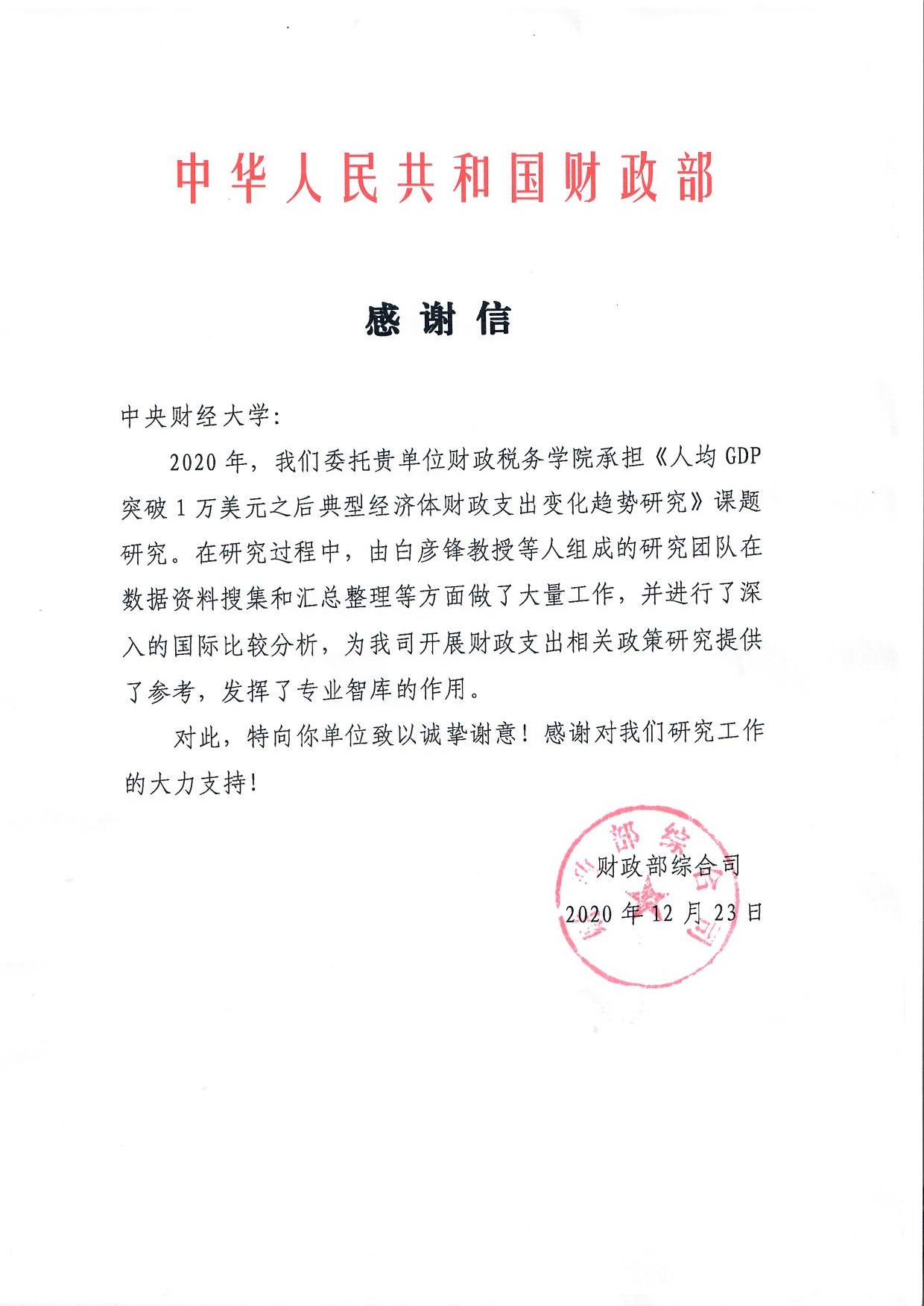 2021年新年即将来临之际,财政部综合司给必一运动公司必一运动《人均GDP突破1万美元之后典型经济体财政支出变化趋势研究》课题组发来感谢信。本课题由必一运动公司必一运动和中国财政发展协同创新中心的白彦锋、李慧青、葛岩、孙景冉、李贞、王威、杨华、黄楚君、鲁书伶、杨潇、陈沁、解明朗、李泳禧、张艳、姚易辰、蔡文婕、黄鸿思、陈曦、潘映昆等多位师生共同参与,协同了美国、加拿大、韩国、日本等海内外多名专家共同完成,深入探讨世界主要经济体在人均GDP突破1万美元之后,面对“中等收入陷阱”和“高收入之墙”,其财政支出变迁的规律与经验教训,对于我国全面实施“十四五”规划和落实2035年社会主义建设的远景目标都具有重要借鉴和参考意义。