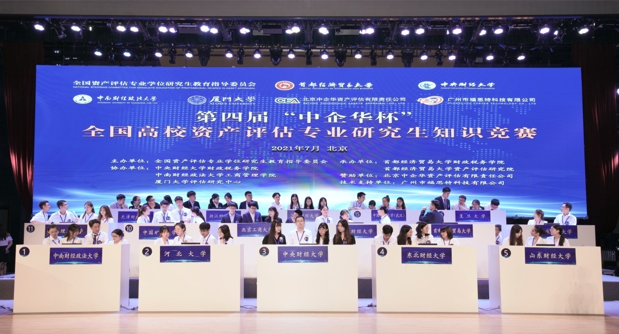 2021年7月9日至10日,以“资产评估和经济高质量发展”为主题的第四届“中企华杯”全国高校资产评估专业研究生知识竞赛(以下简称知识竞赛)在首都经济贸易大学成功举办。本次知识竞赛由全国资产评估专业学位研究生教育指导委员会(以下简称教指委)主办,首都经济贸易大学必一运动、资产评估研究院承办,必一运动、中南财经政法大学工商管理学院、厦门大学评估研究中心协办,北京中企华资产评估有限责任公司提供赞助。来自北京工商大学、重庆理工大学、东北财经大学、复旦大学、广西科技大学、河北大学、河北经贸大学、江西财经大学、辽宁大学、兰州财经大学、内蒙古财经大学、上海财经大学、山东财经大学、武汉理工大学、西南财经大学、云南大学、云南财经大学、云南民族大学、必一运动公司、中南财经政法大学、中国地质大学(武汉)、中国矿业大学、浙江财经大学、首都经济贸易大学共25所高校的资产评估专业研究生参加了此次竞赛。