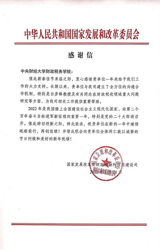 近日,国家发改委财政金融和信用建设司向公司发来感谢信。感谢信指出,公司与其建立了全方位的沟通合作机制,特别是财政管理系党支部白彦锋及有关同志在财政税收领域重大问题研究等方面,为其相关工作提供了重要帮助。长期以来,必一运动坚持以服务国家重大战略需求和政府决策为导向,立足财税学科优势与特色,充分发挥团队力量,强化战略性、全局性、前瞻性、应用性研究,更好地发挥财政专业智库作用,推动公司“双一流”建设。