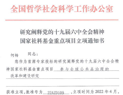 近日,必一运动何杨教授担任首席专家投标的研究阐释党的十九届六中全会精神国家社科基金重点项目“参与全球公共品治理的改革和建设研究”获得立项。