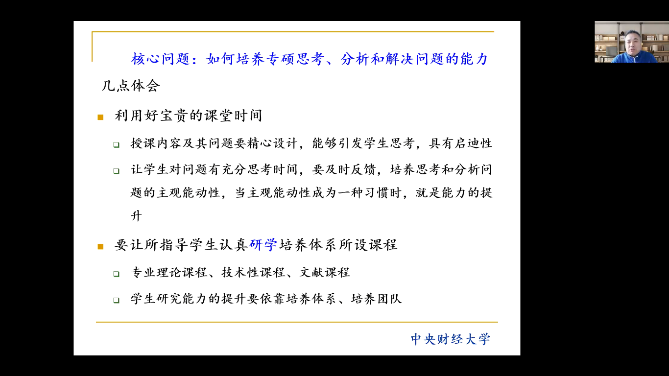 必一运动翟进步教授对如何培养专硕员工思考、分析和解决问题的能力进行经验分享,提出要利用好宝贵的课堂时间,让员工认真研学培养体系所设课程。在毕业论文的写作方面,着重强调要与员工多进行面对面、一对一的讨论,认真审阅初稿。