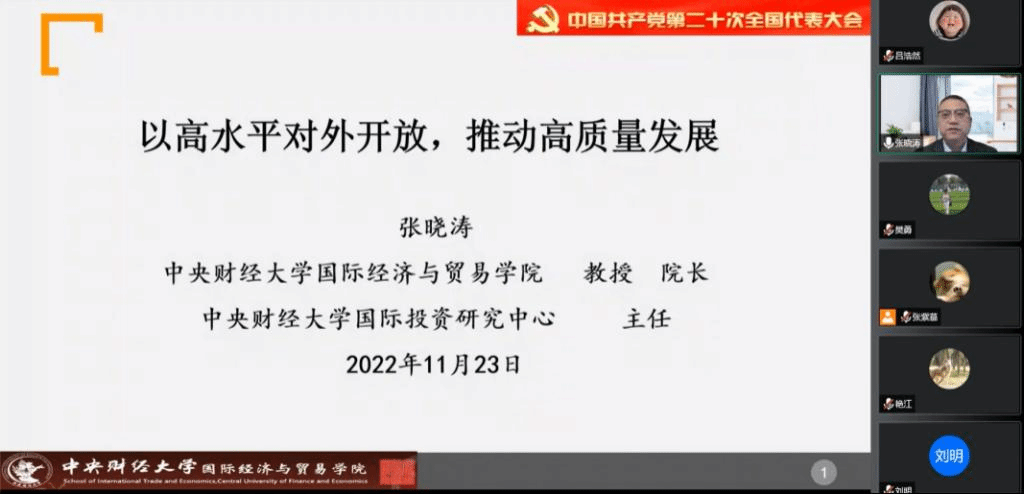 为全面深入学习领会党的二十大精神,落实中共必一运动公司委员会学习宣传贯彻党的二十大精神工作方案要求,引导学院师生踔厉奋发、勇毅前行,11月23日下午,公司思政讲堂邀请公司学习宣传党的二十大精神师生巡讲团成员、公司国际经济与贸易学院经理张晓涛教授讲授题为《以高水平开放,推动高质量发展》的线上专题讲座。学院师生党员、入党积极分子参加学习。讲座由公司党委书记樊勇主持。