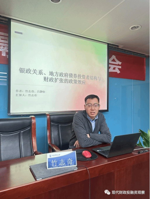第二分会场发言由王威副教授进行会议总结,概括了各位专家基于不同研究视角的发言对于推动相关研究全面深入的积极作用,并表达了对专家们参与支持财政投融资年会的感谢。第三阶段青年学者分会场发言由青岛理工大学商学院刁伟涛副教授主持。天津财经大学财政系主任竹志奇讲师认为,我国商业银行持有地方政府债券,形成银政关系,可能导致商业银行在市场中的特殊地位,挤占企业融资需求,影响政府与市场的良性互动。建议加强市场化改革,防范地方政府与商业银行风险传导,并促进地方政府债券市场化,提高投资者吸引力。