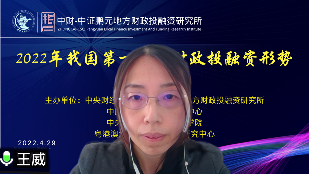 中财-中证鹏元地方财政投融资研究所副所长王威副教授,详细介绍了第一季度我国政府债券发行形势,首先,就利率债发行情况而言,一季度利率债发行总量为4.82万亿元,净融资2.16万亿元,均创历史同期最高;发行利率延续下降态势,仅高于2020年第二季度。同时,就国债和地方债发行情况与特点而言,一季度国债共发行1.61万亿元,同比增长11.45%;地方政府债发行量达1.83万亿元,同比增长103.84%。国债净融资为负,期限结构仍以关键期限为主,无50年期国债发行。王威教授指出,整体而言,国债发行比较平稳,节奏稍快。地方债方面,与2021年同期相比,2022年一季度地方债多发明显,从结构来看一般债发行减少而专项债多发明显;一季度地方债发行以新增债券为主,新增地方债1.57万亿元;平均发行期限为14.6年,发行期限拉长。在地方债发行总规模地域分布方面,不同省市地方债发行规模存在一定分化,但结构总体均以新增专项债为主,其中广东、山东、浙江、四川、北京5省(市)一季度地方债发行量破千亿,结合2021年各省市的财政数据,不难发现地方政府债的发行规模往往与其经济发展、产业结构、税收收入、人口老龄化等因素相关。此外,考虑到国际地缘政治风险升级、宏观经济环境严峻,叠加国内目前疫情影响,预计未来财政政策和货币政策更为积极且相互配合、政府发债的杠杆效应将比以往更快,市场流动性环境充裕、专项债快节奏发行将成为第二季度债券市场的明显特征。