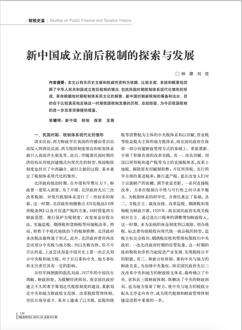 公司2019级博士研究生林源与中国财税法学研究会副会长、国家税务总局税收科研所原所长刘佐在《税务研究》2019年第10期合作发表《新中国成立前后税制的探索与发展》一文。