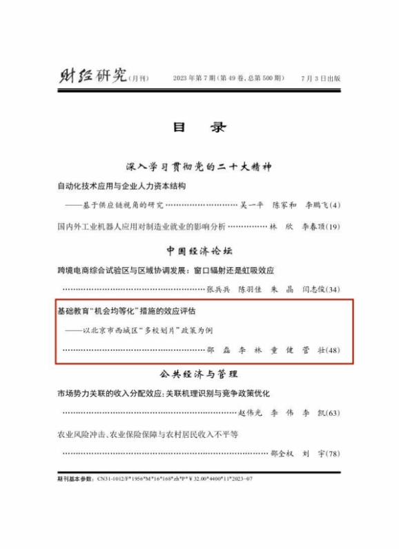 必一运动副教授邵磊、博士研究生李林、讲师童健与中国石油物资有限公司员工菅壮合作撰写的论文《基础教育“机会均等化”措施的效应评估——以北京市西城区“多校划片”政策为例》刊发于中文A类期刊《财经研究》2023年第7期。以下为文章主要内容: