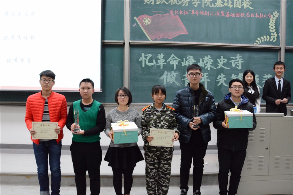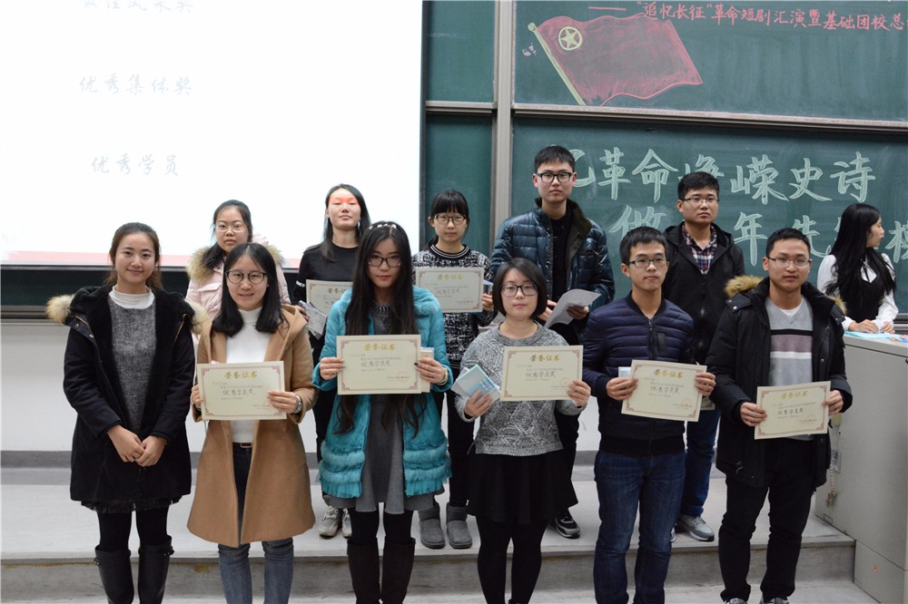 最后是激动人心的颁奖环节。首先颁布的是本次话剧汇演的最佳风采奖,第二组同学凭借其精彩的表演夺得该奖项。该组学员演绎了一个假医务兵为了谋生混入红军队伍,见死不救,最终在一系列荒唐的梦中领悟了红军战士的伟大,与敌人同归于尽的故事。短剧结构精巧,演员们演技高超,引得台下观众们笑声连连。马江聆老师为获最佳风采奖的小组颁奖。第二个奖项是本次基础团校活动的优秀学员,来自各组的学员们凭借其在本次活动中的辛勤付出和从中体现出的责任感而摘得这一荣誉。最后是优秀集体奖,这一奖项由在各个活动中表现优异的第三组和第七组的同学活动。蒋绮雯老师为优秀学员和优秀集体奖代表学员颁奖。