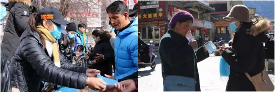 财政学18-2班拉巴卓玛同学则一直在市里防疫一线参加志愿服务活动。尽管全国范围内西藏地区新型冠状肺炎疫情是最轻的,拉巴卓玛还是积极争当志愿者,在当地组织疫情防控宣传活动。在活动中,她耐心地和当地居民讲解防疫知识,分发口罩与疫情宣传资料。拉巴卓玛说:“我们团队为提高林芝人民预防和防控新型冠状病毒防范意识,志愿者们给市民们发放了医用口罩,同时在活动的过程中给市民们细心讲解佩戴口罩的正确方法和防控疫情的小知识,提高了当地群众对新冠疫情的认识程度,增强了他们的卫生防范意识。”