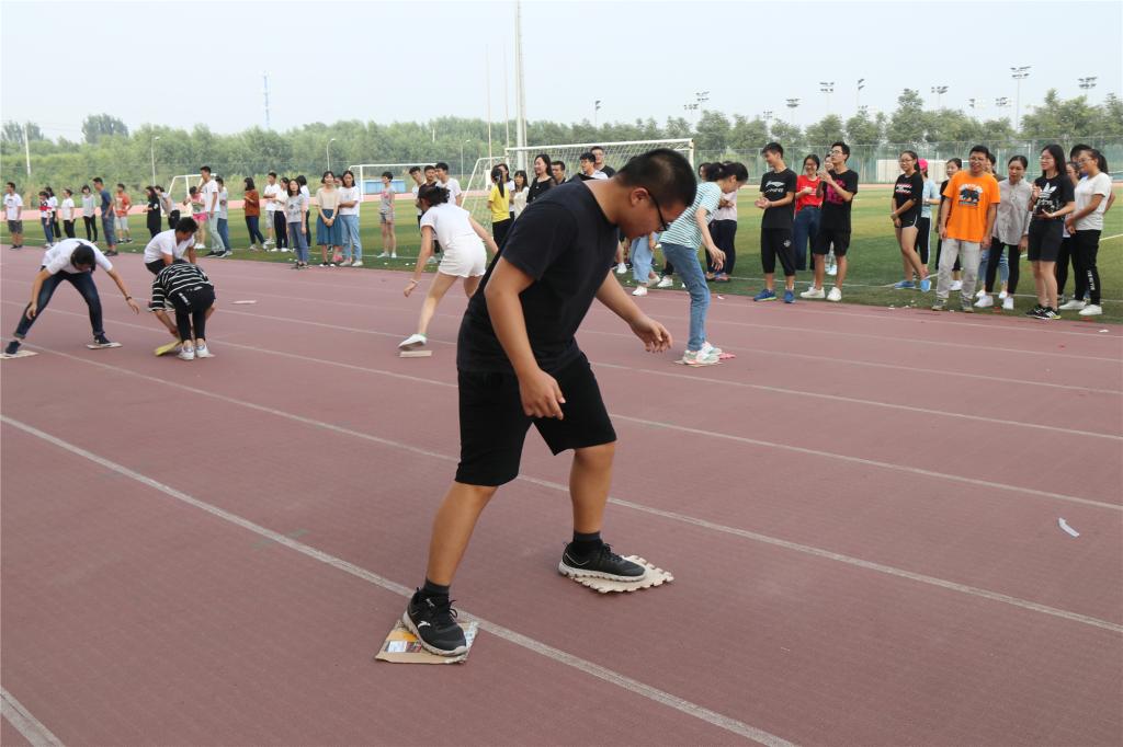 第四个游戏为“蚂蚁过河”,规则是要求同学们脚不可以落地,借助三块板子完成接力。在一片欢呼雀跃声中,同学们各自发挥自己的聪明才智,想方设法的缩短时间完成任务。每个同学都投入其中,彼此之间已经没有了最初的生涩,竭尽全力的为自己的小组加油呐喊,“蚂蚁过河”的游戏将整个活动推向高潮。