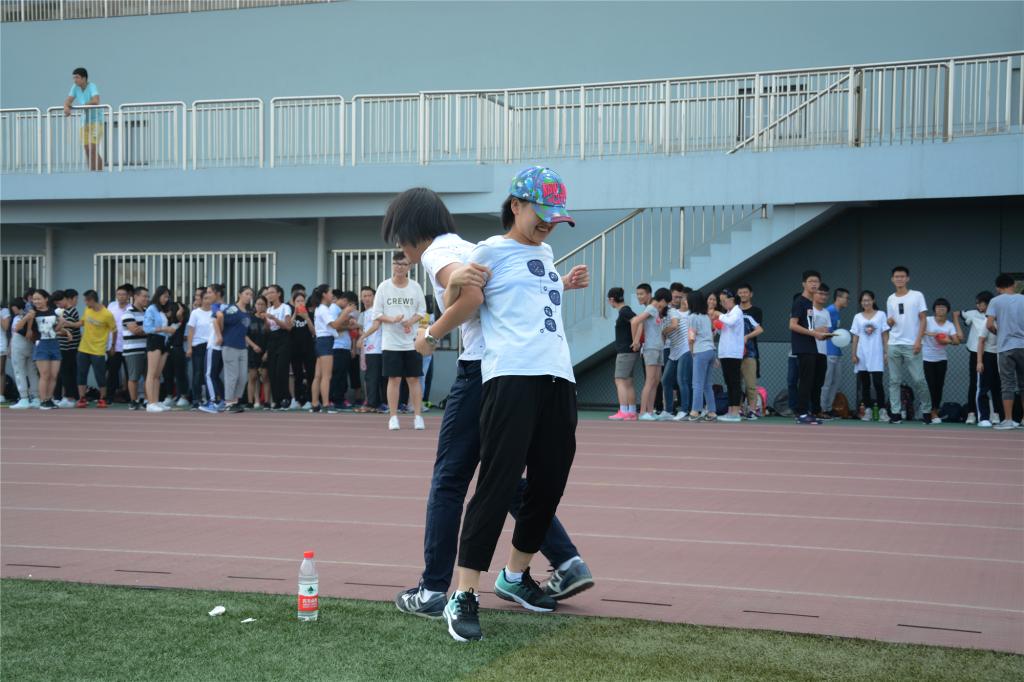 随后进行的“背气球”环节,则是让新生们依据指挥两人一组,相互合作,在哨声吹响时,新生在起点开始吹气球,打结,最后两个人背靠背,将气球夹在两人的背之间走向终点。到达终点后,将气球挤爆后下一组开始游戏。从这个游戏开始,游戏将进行名次排序,对于排名靠后的组会有惩罚。新的比赛形式使同学们更加团结,每一轮比赛都齐心协力,全情投入。
