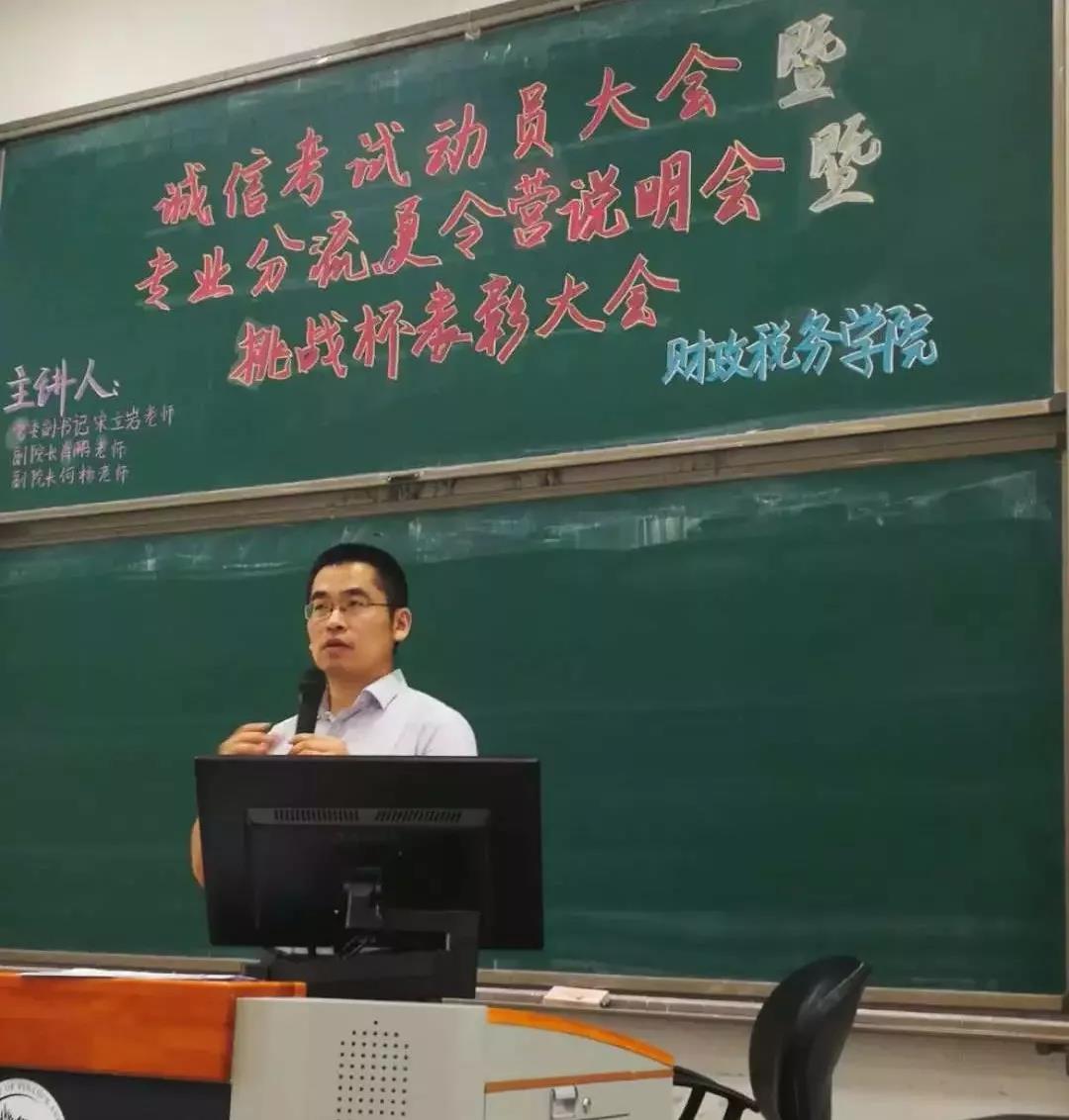接下来,肖鹏副经理上台讲话,他为同学们说明了专业分流和保研的相关情况。肖老师首先为大家讲解了专业分流的具体流程、分流标准、志愿填报等情况,并为大家介绍了公司的财政、税收、资产评估三个专业的学科特点。肖老师告诉大家,选择专业一定要慎重,要仔细思考,并征询父母的意见,最终做出决定。