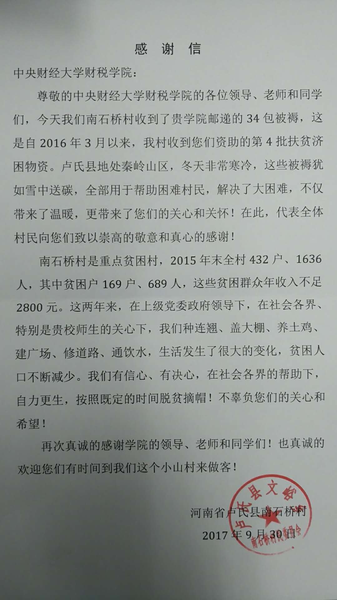 在院员工工作办公室和团总支负责老师精心协调下,共整理了学院在以往开展活动中积存的34包被褥,并统一打包邮递到南石桥村。南石桥村委会在接收到捐献物资后,特发来感谢信,表示扶贫物资为山区人民解决了过冬的大困难,犹如雪中送炭,带来了温暖和关怀。