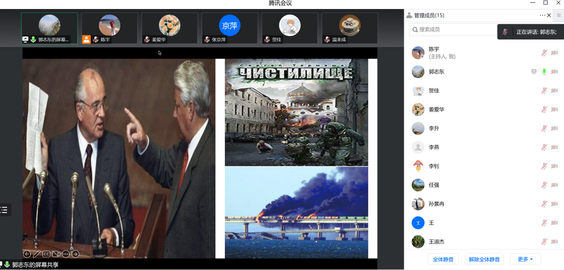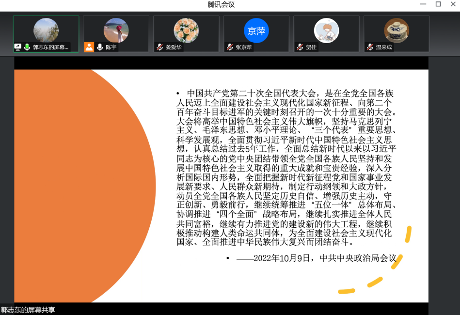党的二十大召开在即,根据学校文件精神以及公司党委工作安排,国际税收系党支部与财政管理系党支部于2022年10月10日晚7:00通过腾讯会议联合举办了迎接党的二十大主题宣传教育活动。会议的议题有三项,一是国际税收支部郭志东老师报告党史学习专题《历史自信与中国特色社会主义道路》 ;二是支部党员就“强国有我新征程,喜迎党的二十大”展开讨论;三是财政管理支部书记姜爱华老师做会议总结。