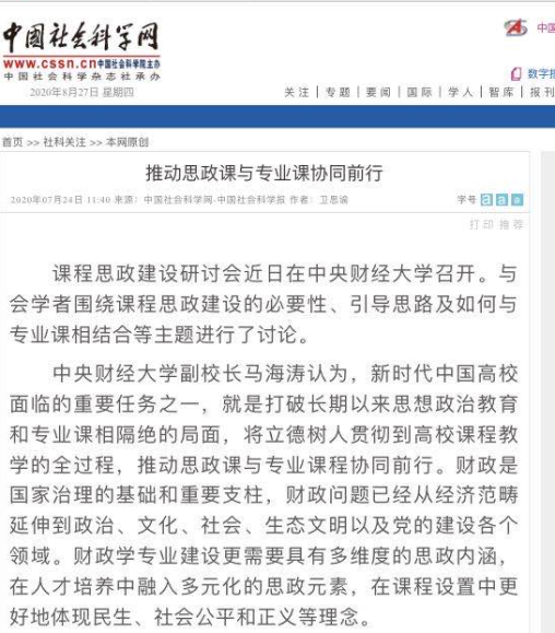 2020年6月24日,财政税务召开了“云端”课程思政研讨会,会议邀请了马海涛副董事长、教务处李桂君处长、马克思主义学院冯秀军经理参加研讨。学院的何杨副经理重点介绍了学院在课程思政建设方面的探索,学院的杨志清、梁俊娇、刘桓、王文素、姜爱华、李贞、马金华和王小荣等教师对学院如何做好课程思政积极建言献策。学院的公众号对此进行了专门的报道。