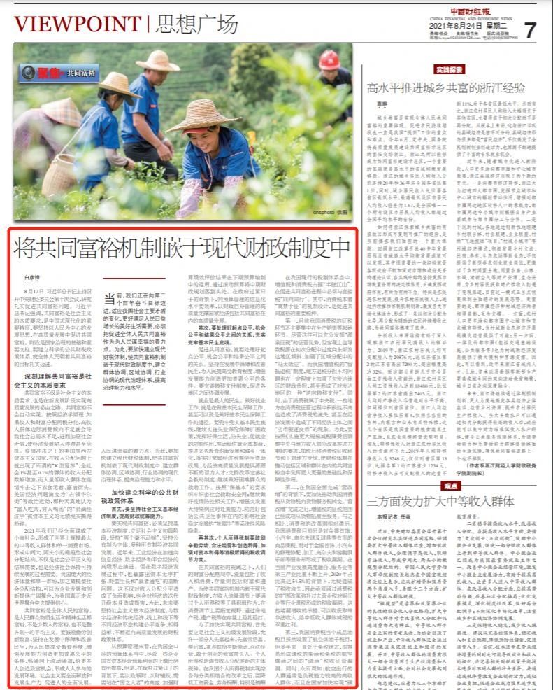 近日,由白彦锋教授撰写的文章《将共同富裕机制嵌于现代财政制度中》于《中国财经报》2021年8月247版发表。全文如下: