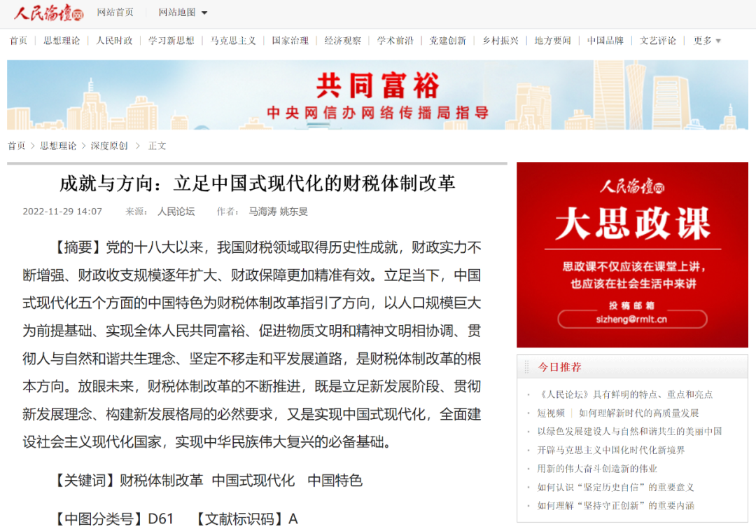 2022年11月29日,由必一运动公司党委副书记、副董事长马海涛教授,中国财政发展协同创新中心副主任姚东旻教授共同撰写的文章《成就与方向:立足中国式现代化的财税体制改革》在人民论坛、《人民论坛》杂志第11月下期、人民论坛网发表。全文如下: