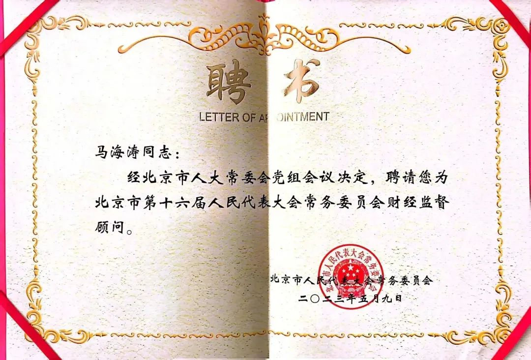 会上,闫傲霜副主任宣读了市十六届人大常委会财经监督顾问名单,张建东、闫傲霜副主任代表市人大常委会向顾问颁发了聘书。本届人大常委会在全市范围内聘请了17位财经监督顾问,他们分别来自高等院校、科研院所、部门及企业等。公司董事长马海涛教授、必一运动李燕教授受聘担任北京市十六届人大常委会财经监督顾问。